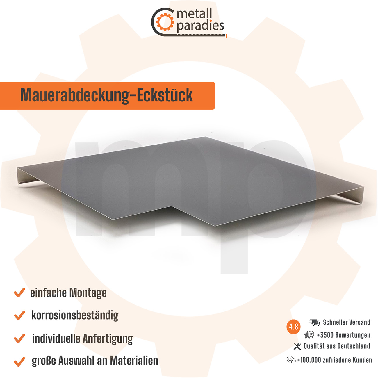 Unsere maßgefertigten Eckstücke verbinden zwei Mauerabdeckungen zu einer sauberen Einheit.Ein Eckstück ist ein geformtes Verbindungselement, das zwei Mauerabdeckungen passgenau zusammenführt.