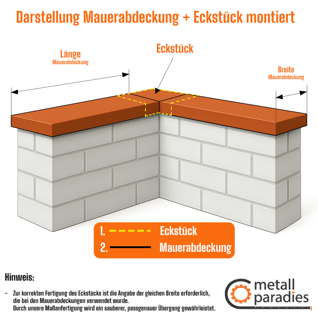 - Zur korrekten Fertigung des Eckstücks ist die Angabe der gleichen Breite erforderlich, die bei den Mauerabdeckungen verwendet wurde. Durch unsere Maßanfertigung wird ein sauberer, passgenauer Übergang gewährleistet.